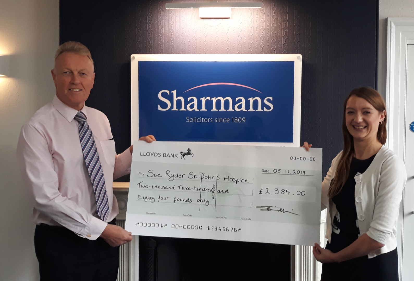 Sharmans donates £2,384 to Sue Ryder St. John's Hospice in Moggerhanger