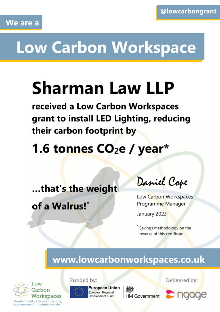 We have received a Low Carbon Workspaces grant to install LED Lighting, reducing our carbon footprint by 1.6 tonnes CO2e / year*.